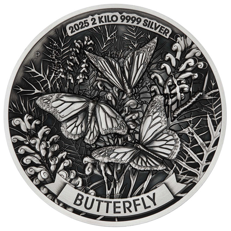 На реверсе изображены три бабочки, опыляющие цветки гревиллеи. Каждая бабочка имеет свои уникальные черты. Вверху слева монограмма Пертского монетного двора Р, внизу справа инициалы дизайнера JM (Jennifer McKenna), Вверху надпись: 2025 2 KILO 9999 SILVER (год чеканки, вес и проба серебра). Внизу на ленте: BUTTERFLY (Бабочка).