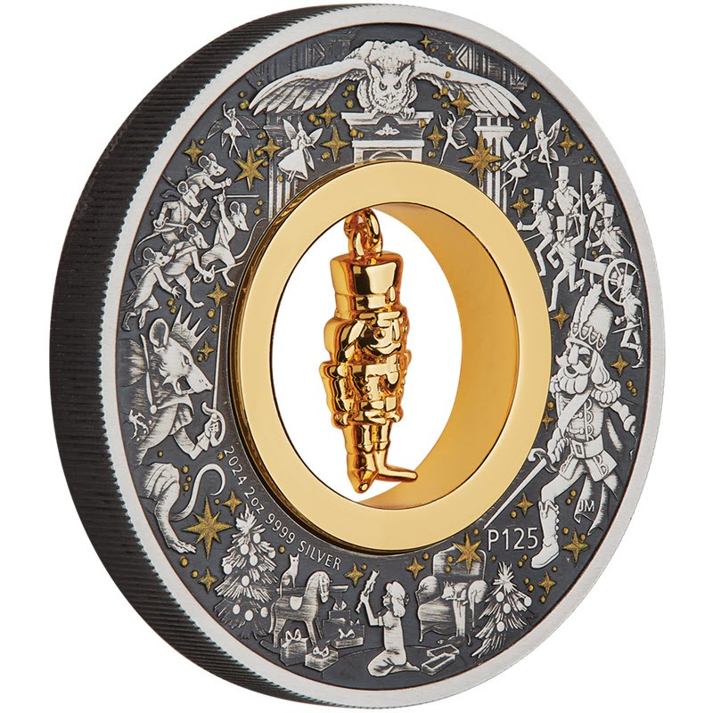 Серебряная монета от Пертского монетного двора Австралии весом в 2 тройские унции посвящена Щелкунчику. У нее качество антик и выборочное золочение. Поставляется в оригинальном футляре с сертификатом подлинности. Тираж: 2500 штук.