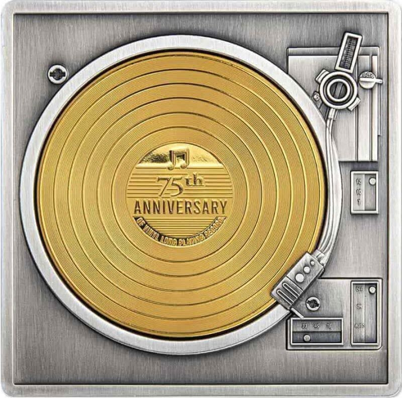 Эта потрясающая серебряная монета весом в 3 унции посвящена 75-летию виниловой пластинки. У нее оригинальный дизайн,размеры 60х60х4 мм, выборочное золочение в 24К и античная отделка. Поставляется в оригинальном футляре с сертификатом подлинности. Тираж: 999 штук.