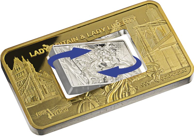 На реверсе внешней монеты изображены: слева Тауэрский мост, справа Бруклинский мост. Вверху надпись: LADY BRITAIN & LADY LIBERTY, внизу слева: FOUR 4 VERSO (4 версии), внизу справа: 45.7 g .999 gold-plated (вес и проба серебра, золотое покрытие).
