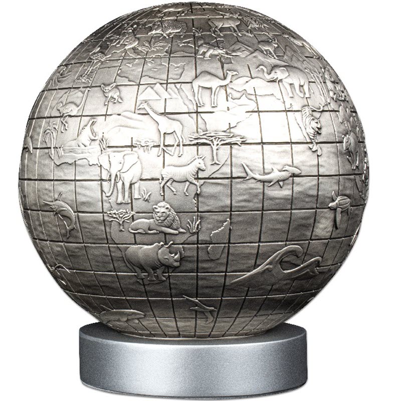Удивительная серебряная монета весом 1000 грамм качества антик посвящена животным мира и показывает их на континенте их происхождения. Первая в мире сферическая монета диаметром 150 мм! Тираж: 199 штук.