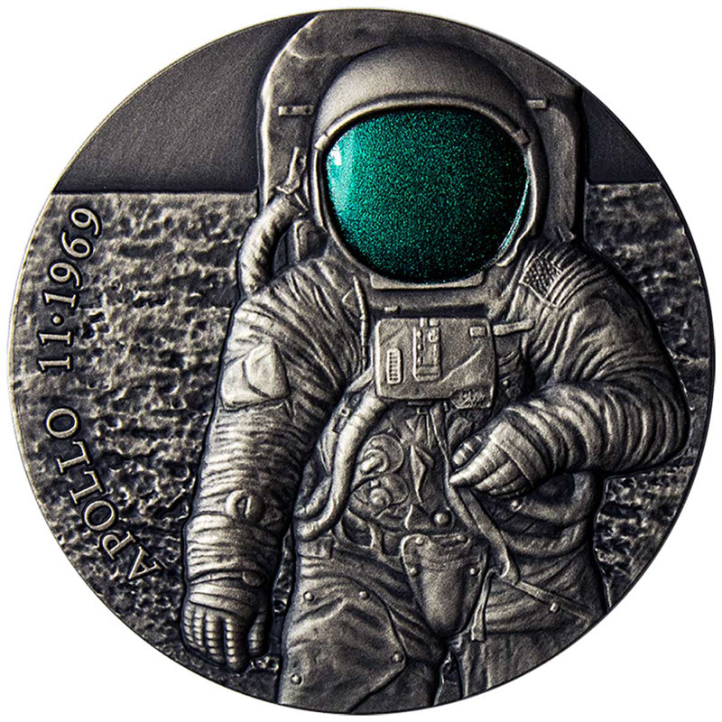 На реверсе изображен Нил Армстронг в полном космическом снаряжении. На шлеме перламутровое покрытие, которое при повороте меняет свой цвет. Слева у канта надпись: APOLLO 11 · 1969 (Аполлон-11, год высадки).