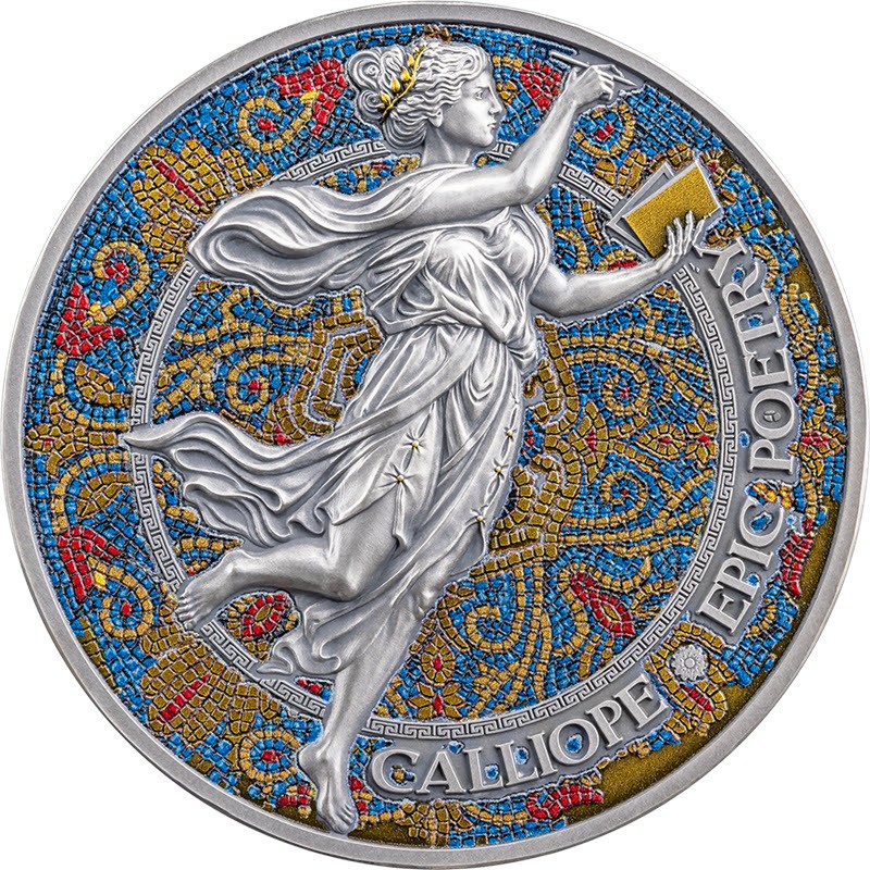 Серебряная монета весом в 2 унции - первая из серии «Девять муз». У нее качество античной отделки, высокий рельеф, выборочное золочение и селективная окраска. Поставляется в оригинальном футляре с сертификатом подлинности. Тираж: 500 штук.