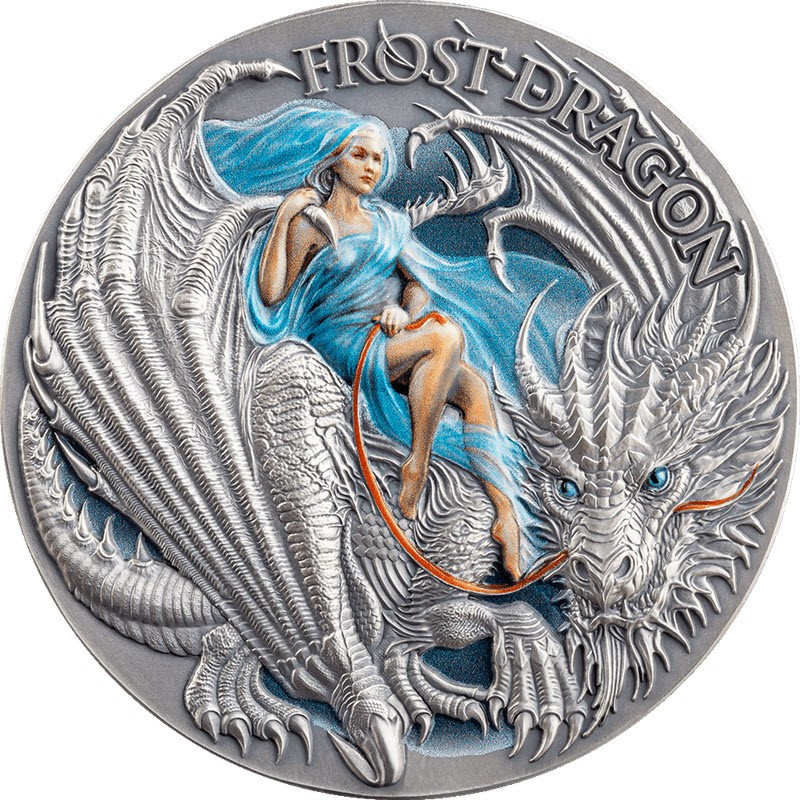 На реверсе изображен дракон с девушкой, одетой в мантию небесно-голубого цвета. Вверху надпись: FROST DRAGON.
