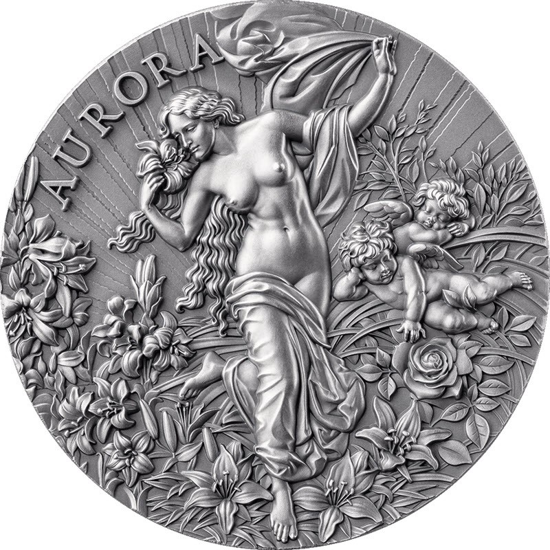 На реверсе интерпретация картины Вильяма-Адольфа Бугро «Рассвет», изображающую Аврору на фоне цветущего сада, амуров в озарении первых лучей света. Вверху надпись: AURORA