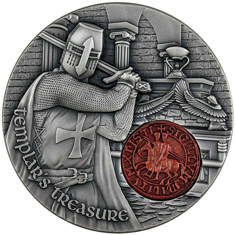 Эта удивительная серебряная монета 2020 года весом в 2 унции посвящена рыцарям-тамплиерам, которых считают хранителями сокровищ. У нее античная отделка, высокий рельеф и украшена печатью из сургута. Поставляется в оригинальном футляре с сертификатом подлинности. Тираж: 500 штук.