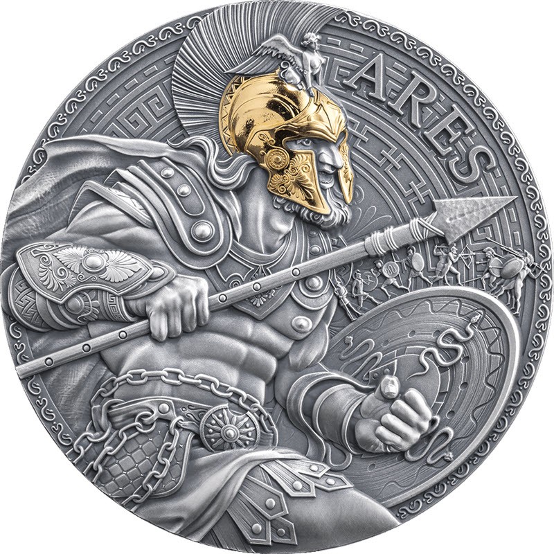 На реверсе изображен Арес в боевых доспехах на фоне сражающихся воинов. На голове у него шлем с выборочным золочением. Вверху богиня победы Ника, правее надпись: ARES.