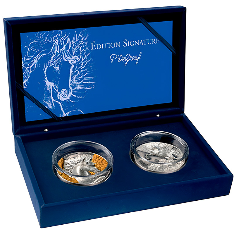 Этот чудесный набор «Пегас» из серии «Специальное издание» («Édition Signature») состоит из двух серебряных монет по 5 унций каждая, выпущенных частной бельгийской мастерской (P. De Greef) и включает два выразительных изображения Пегаса, созданных известным скульптором Бени Дебакером. Обе монеты выполнены в технике сверхвысокого рельефа. Особенностью одной из них является применение техники «Алмазный пуансон» (Diamond Punch), которая создает эффект мерцания и огранки на поверхности серебра. Дополнение дизайна выборочным черным родиевыми покрытие и золочением создает выразительное сочетание света, теней и динамики. Поставляются в роскошном деревянном футляре, ограниченным тиражом всего в 500 комплектов по всему миру.
