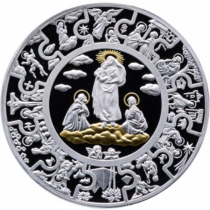 На реверсе внутреннего круга изображена Дева Мария с позолоченным нимбом и младенцем Иисусом на руках, стоящая на позолоченном облаке в окружении двух святых. Во внешнем круге изображение 12 сцен из жизни Иисуса: от Его рождения до Его воскресения.