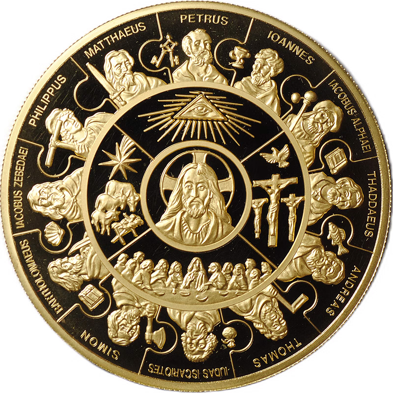 Монета имеет сложное изображение, состоящее из трёх частей, разделённых окружностями. В центральном круге изображён лик Иисуса Христа. Вторая часть включает четыре сегмента, внутри которых изображены: глаз в треугольнике — древний символ Бога, внизу — Тайная вечеря, слева и справа — границы земной жизни Спасителя: Рождество и Распятие. Третья часть выполнена в виде пазла и включает изображения 12 апостолов, начиная с апостола Петра в верхней части монеты, и заканчивая Иудой в нижней.