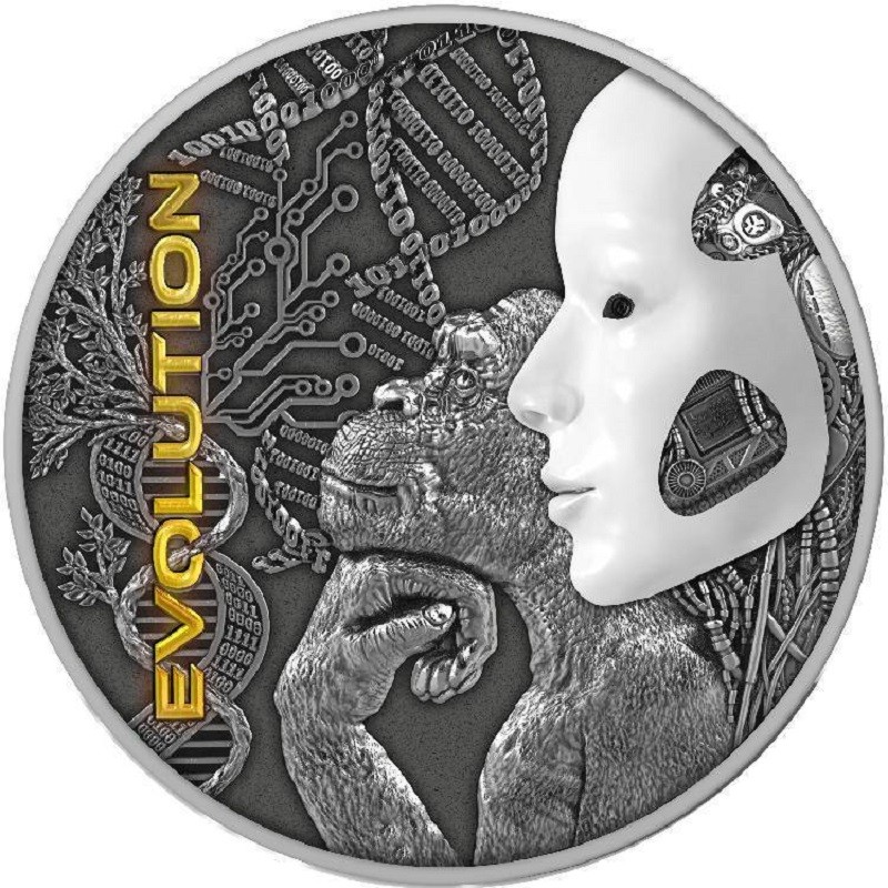 Эта серебряная монета весом в 2 унции посвящена эволюции человечества: от обезьян до роботов. Монета имеет красивый частично позолоченный дизайн, качество античной отделки, 3D-вставку и поставляется в тематическом футляре вместе с сертификатом подлинности. Ограниченный тираж 500 штук по всему миру!