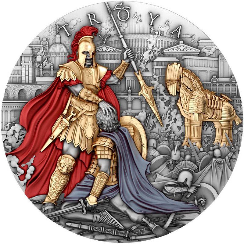 Эта удивительная серебряная монета весом в 2 унции посвящена легендарному городу Троя. У нее качество античной отделки, высокий рельеф и выборочное золочение. Поставляется в оригинальном футляре с сертификатом подлинности. Тираж: 500 штук.