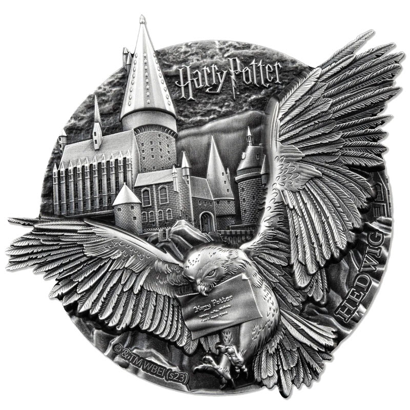 Эта удивительная серебряная монета посвящена сове Хедвиг, верному другу Гарри Поттера. У нее размеры 77х69 мм, ультравысокий рельеф и качество античной отделки. Поставляется в элегантном футляре с сертификатом подлинности. Тираж: 499 штук.