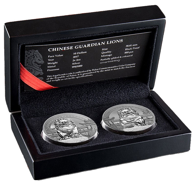 Набор Палау 2017 года посвящен китайским стражам-львам. У них качество черный пруф, селективная окраска и выборочное золочение. Поставляется в оригинальном футляре с сертификатом качества. Тираж: 888 штук.
