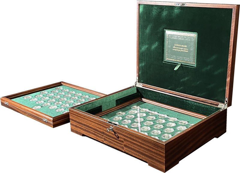 Медали размещены в тяжёлом, элегантном футляре-чемодане из дерева. Футляр закрывается на ключ, который искусно встроен в конструкцию и практически незаметен.