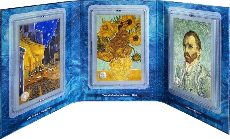 Этот чудесный набор из 3 серебряных монет весом 1 унция каждая посвящен Винсенту ван Гогу и приурочен к 135-летию со дня его смерти. У них размер 254 Х 170 мм, музейное качество цветной печати Giclée, глубокая гравировка на оборотной стороне и качество BU. Поставляются в оригинальном футляре с сертификатом подлинности. Тираж: 1499 штук.
