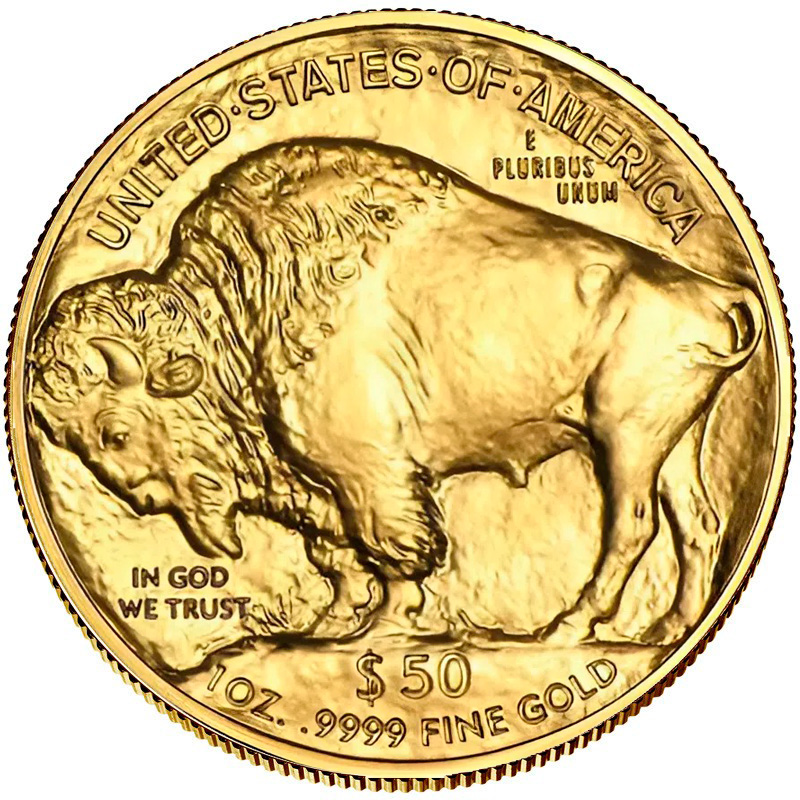 На реверсе золотой монеты помещено изображение бизона, сверху надписи: UNITED STATES OF AMERICA - Соединённые Штаты Америки, E PLURIBUS UNUM - Из многих - единое. Внизу надписи: IN GOD WE TRUST - В бога веруем, 1 oz. 0.9999 FINE GOLD — чистое золото 999,9 пробы и номинал монеты - $ 50.